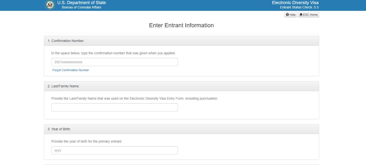 2. Saisissez votre numéro de confirmation à 16 chiffres qui vous a été attribué au début de la loterie DV ou de la carte verte.